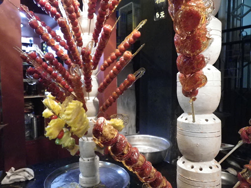 I had heard about this street with crazy snacks so I had to check it out. The scorpions were still moving on the sticks! I did see a Chinese man eating them too (I thought they were just for the tourists) . The strawberries (and other fruit) covered in a sugar coating were SO yummy! Apparently this snack originated in Beijing and is very popular!