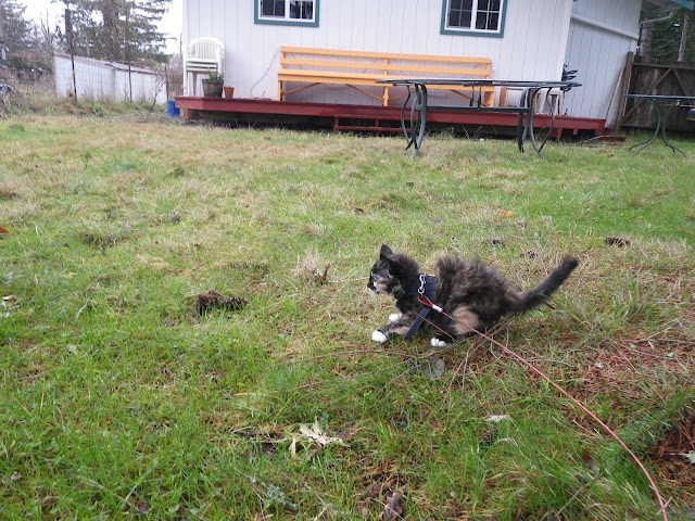 We took Sushi outside yesterday on the leash. She was pretty timid, but enjoyed the smells and sights!